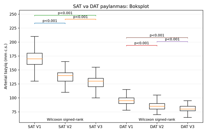 Cədvəl 6-da 3-cü məlumat toplanması zamanı bütün xəstələrdə Co-Vamloset ilə antihipertenziv müalicəyə riayətkarlığın qiymətləndirilməsi (N=417) göstərilmişdir. 3-cü məlumat toplanması zamanı pasiyentlərin böyük əksəriyyəti Co-Vamloset preparatını hər gün qəbul etmişdir (67,9%). Unutma halları əsasən nadir xarakter daşımışdır: pasiyentlərin 24,2%-i dərmanı həftədə 1 dəfədən az, 6,7%-i həftədə 1–2 dəfə unutmuş, yalnız 1,2% pasiyent isə həftədə 2 dəfədən çox dərman qəbulunu buraxmışdır. Cədvəl 7-də müalicə fonunda optimal AT səviyyəsinə (AT ≤130/80 mm c.s.) çatan xəstələrin dinamikası göstərilmişdir. Optimal AT səviyyəsinə çatan xəstələrin payı müalicə müddətində ardıcıl şəkildə artmışdır: 1-ci məlumat toplanması zamanı 3,9% (n=18), 2-ci mərhələdə 26,1% (n=121) və 3-cü mərhələdə isə 46,4% (n=213) təşkil etmişdir. Bu dinamika Co-Vamloset ilə müalicə fonunda AT-ə daha ciddi nəzarət səviyyəsinə zamanla daha çox pasiyentdə nail olunduğunu göstərir. 2-ci və 3-cü məlumat toplanması mərhələlərində AT <140/90 mm c.s. olan xəstələrin payı, eləcə də 2023-cü il Avropa Hipertenziya Cəmiyyəti (ESH) əsasən hədəf AT-ə (SAT/DAT <140/80 mm c.s. və yaxşı tolerə edilərsə 130/80 mm c.s.) çatan pasiyentlərin payı qiymətləndirilmişdir (4). 2018 ESC/ESH AH-nın idarə olunması üzrə Tövsiyələrinə uyğun olaraq hədəf AT səviyyəsinə (≤140/90 mm c.s.) çatan xəstələrin payı 2-ci məlumat toplanması zamanı 60,0%, 3-cü məlumat toplanması zamanı isə 90,8% təşkil etmişdir. Bununla yanaşı, daha sərt hədəf kimi qəbul edilən <140/80 mm c.s. səviyyəsinə çatan xəstələrin payı 2-ci məlumat toplanması zamanı 33,5%, 3-cü məlumat toplanması zamanı isə 61,2% olmuşdur. Cədvəl 8-də bütün xəstələr üzrə ümumi AE başvermə tezliyi (N=463) göstərilmişdir. Tədqiqat müddətində bütün xəstələr üzrə təhlükəsizlik qiymətləndirildikdə AE ümumilikdə 29 pasiyentdə qeydə alınmışdır. Ən çox rast gəlinən AE ağız quruluğu olmuşdur (2,5%), ardınca topuqda şişkinlik (1,1%) gəlir. Digər AE (öskürək, qəbizlik, başgicəllənmə və baş ağrısı) aşağı tezliklə müşahidə edilmişdir (≤0,6%). Cədvəl 9-da SAT/DAT göstəricilərinin vizitlər arası müqayisəsi (paired analiz), şəkil 3-də isə SAT/DAT göstəricilərinin paylanması göstərilmişdir. SAT və DAT göstəricilərində izləmə müddətində ardıcıl və statistik əhəmiyyətli azalma müşahidə olunmuşdur. SAT Vizit 1-də 168,3±19,0 mm c.s. ikən Vizit 2-də 138,2±14,4 mm c.s., Vizit 3-də isə 127,3±10,2 mm c.s. enmişdir (Vizit 1 və Vizit 2: p<0,001; Vizit 2 və Vizit 3: p<0,001; Vizit 1 və Vizit 3: p<0,001). DAT göstəricisi də oxşar dinamika nümayiş etdirmiş və Vizit 1-də 97,7±11,5 mm c.s.-dan Vizit 2-də 86,7±12,8 mm c. s.-na, Vizit 3-də isə 81,2±10,3 mm c.s.-na düşmüşdür (bütün müqayisələr üçün p<0,001; Wilcoxon signed-rank testi).