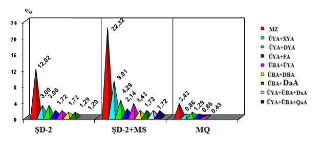 Şəkil 3. Üç xəstələr qrupunda: MS –suz ŞD-2,MS müşayiət olunan ŞD-2 və MQ (ŞD-2 və MS movcud olmayan) müxtəlif magistral arteriyalarda müştərək damardaxili AD (multifokal aterosklerozun) aşkar edilmə tezliyi