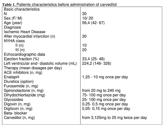 There were 30 patients with NYHA class II or III CHF (males- 20, females- 10) after myocardial infarction aged from 42 to 67 years examined during the investigation. The investigation was performed before and after treatment. The current degree of the patient's heart failure was assessed by echocardiography (registration on Aloka- SSD- 500) by use of the following parameters: left ventricular end- diastolic volume, left ventricular ejection fraction. All patients were treated with basic therapy (glycosides+ diuretics+ ACE inhibitor) and Carvedilol was added from 3,125- 6,25 mg twice a day to 12,5- 25 mg (twice) for 12 weeks (3 months). Dosage was selected individually. The use of other drugs was excluded. Clinical characteristics of the study group are shown in Table 1. Written informed consent was obtained from all patients. Approval was obtained from the local ethics committee.