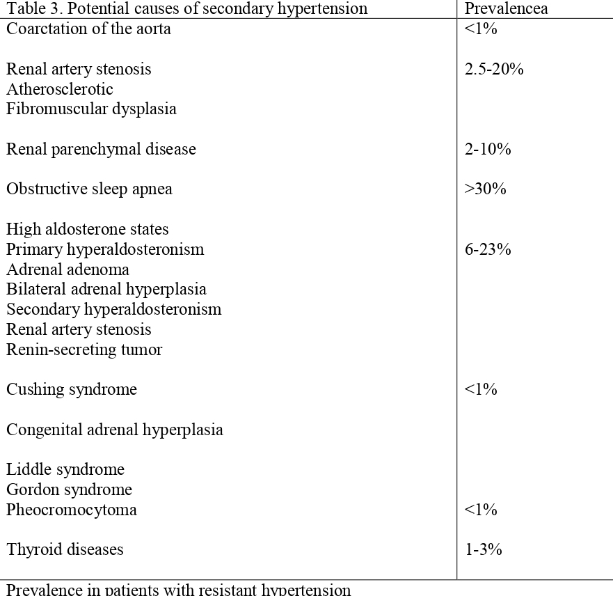 Patients with RH are much more likely to have an identifiable cause of hypertension (secondary hypertension). Previous studies have shown that 5-10% of RH has an identifiable cause [25, 26]. Renal parenchymal disease, as the most common medical cause of secondary hypertension, must be considered [20, 27]. Renal arterial disease, OSA, primary hyperaldosteronism, pheochromocytoma, Cushing’s syndrome, hyper- and hypoparathyroidism, aortic coarctation and intracranial tumors are other causes of secondary hypertension and requires evaluation by a specialist.