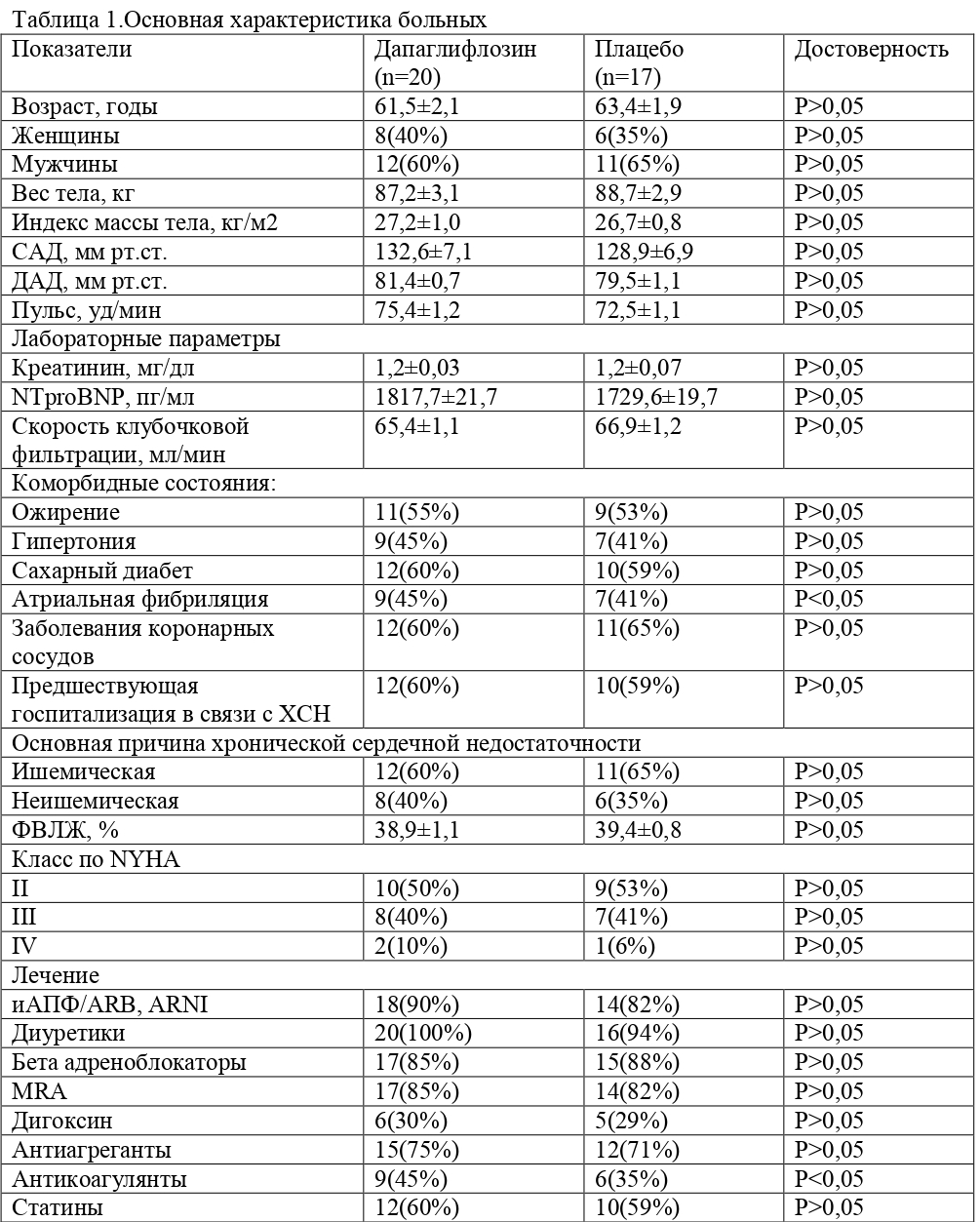 Количество мужчин в обеих группах превышало количество женщин. Уровни АД находились в пределах референсных значений, не превышающих значения 140/90 мм рт.ст. и не ниже 90/60 мм.рт.ст. У больных как в группе дапаглифлозина, так и в группе плацебо наблюдалась легкая степень почечной недостаточности со скоростью клубочковой фильтрации не ниже 50 мл/мин. Наличие хронической сердечной недостаточности у всех больных подтверждалось уровнем NTproBNP ≥600 пг/мл, а у больных с атриальной фибрилляцией ≥900 пг/мл.
