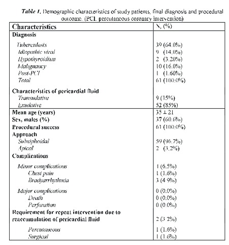 Procedure was performed via subxiphoidal approach in 59 patients and via apical approach in 2 patients. We observed only four minor complications, such as severe chest pain in one patient and severe bradycardia responsive to administration of atropine in three patients. Chest pain was suggested to be a consequence of irritation of intercostal nerves during an apical approach and bradycardia due to either insufficient local anesthesia or irritation of the vagal fibers of diaphragm, pericardium or right ventricular wall. Re-accumulation of pericardial fluid within pericardial space, requiring second intervention was observed in two patients: one with hypothyroidism and one during serous stage of pericarditis secondary to tuberculosis. Accumulation of pericardial fluid within left pleural space was observed in 7 patients, which was suggested to be secondary to the formation of connection between pericardial and pleural spaces. Two of these patients had undergone apical and five of them subxiphoidal approach, and pericardial effusion had serous character in all of these patients. None of the patients with hemorrhagic effusion had transition of fluid in to the pleural space. These cases were successfully managed without need for left-sided thoracentesis. This fluid disappeared during the follow-up in all patients.