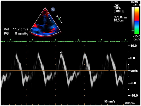 Ürəkdə hər hansı struktur dəyişlikliyin olub olmadığını bilmək üçün 2D, M, TDI-PW rejimlərindən istifadə etməklə exokardioqrafik müayinə aparıldı. Müayinə zamanı sağ mədəciyin (RV) sərbəst divarında çapıq toxumasına bənzər hiperexogen sahə, sağ mədəciyin genəlməsi və sistolik funksiyasının zəifləməsi (FAC – 30.5%, N > 35%) aşkarlandı (şəkillər 2-8). Bunun ardınca təyin olunan EKQ-nin 24 saatlıq Holter monitorlamasında çoxlu miqdarda (politop, qrupşəkilli, triplet) mədəcik ektopiyası qeydə alındı (şəkil 9). Bu nəticələrə asasən xəstədə aritmogen sağ mədəcik displaziyasına (ARVD, ARVC) şübhə yarandı və ürəyin MRT olunmasına qərar verildi. Ürəyin MRT müayinəsində aritmogen displaziyaya uyğun görüntülər qeydə alındı.