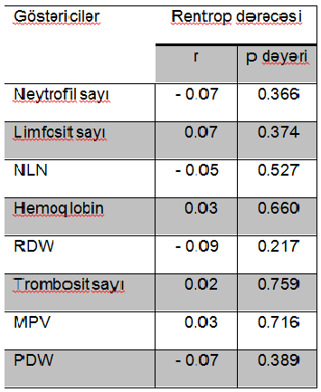 Qeyd: PV - trombositlərin orta həcmi; NLN -neytrofil-limfosit nisbəti; PDW - trombositlərin paylanma genişliyi; RDW - eritrositlərin paylanma genişliyi; TLN - trombosit-limfosit nisbəti.
