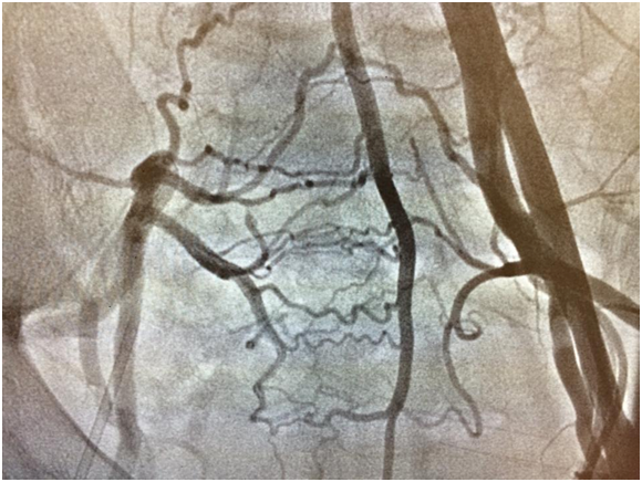 Xəstəyə ürək boşluqlarının kateterizasıyası qərarı verildi. Kateterizasiya zamanı sağ femoral arteriyanı punksiya məqsədilə palpasiya etdikdən nəbz qeyd edilmədi. Bu səbəbələ xəstənin sol femoral arteriya və venası punksiya olundu. Ürək boşluqları kateterizasiya olundu və xəstənin inoperabel olduğu qərarı verildi. Sağ femoral arteriyada nəbz qeyd olunmadığından xəstəyə abdominal aortaqrafiya olundu. Aortoqrafiya zamanı xəstənin sağ ümumi, daxili və xarici qalça arteriyalarının olmaması, aortanın bifurkasiya nahiyəsinin və sol ümumi qalça arteriyasının başlanğıcının fibromuskular distrofiyaya məruz qalması və sağ aşağı ətrafın sol daxili qalça, orta oma arteriyalarından gələn anastamozlar vasitəsilə qidalandığı aşkar edildi. Xəstə asimptomatik idi. Bu səbəbdən təqib qərarı verildi, heç bir müdaxilə olunmadı. (Şəkil 4,5,6)