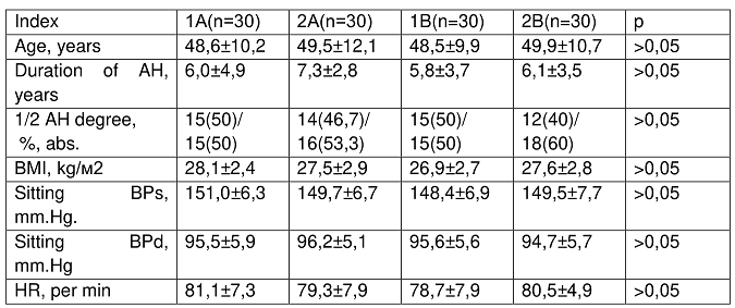 Finally, were analyzed 82 patients whocompleted thescheduledtreatmentwithin 3 months: ingroup1A-23 patientsingroup 2A-21 ingroup1B- 19 ingroup 2B-19. Thelower bloodpressure (BP) to the target( 140/80mm Hg) all patients.