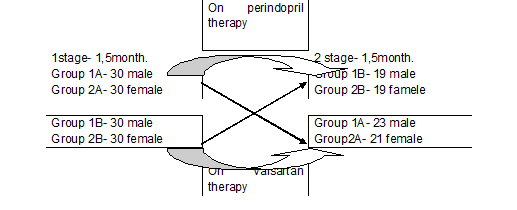 A total of 120 patients of 45-65 years old during 3- month study were split into four groups with 30 people in each: 1A,1B included men, and 2A,2B – women. For the first six weeks 1A, 2A group patiens received perindopril 5-10 mg ( Prestarium) per day,while 1B,2B subgroup patients were treated with valsartan 80-160 mg ( Novartis) per day. Then the therapy was crosswise changed. The study design is presented in fiqure 1.