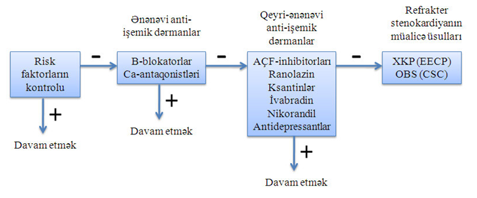 Bütün pasiyenlərdə risk faktorları nəzarət altında saxlanılmalıdır. Simptomlar pis nəzarət olunduğu halda əlavə anti-işemik dərman preparatlarının istifadəsi tövsiyə olunur. Refrakter simptomları və həyat keyfiyyətinin çox dərəcədə məhdud olan pasiyentlər üçün Güclənmiş Xarici Kontrpulsasiya və yaxud Onurga Beyininin Stimulyasiyası tövsiyə oluna bilərlər.