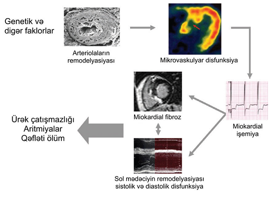 Hal-hazırda sübüt olunub ki, Kardial Maqnit Rezonans Tomoqrafiya ilə vizualizasiya olunan qadolinium ilə gec güclənmə effekti hipertrofik kardiomiopatiyada miokardial fibrozun əlamətidir [69, 70]. Bu tədqiqatların əsasında göstərilib ki, koronar mikrovaskulyar disfunksiya uzun müddət ərzində təkrarlanan işemiya epizodlarını yarada bilər və nəticədə miositlərin ölümünə səbəb ola bilər, və bu sahələr getdikcə fibrozlaşır [71] (Şəkil 2).